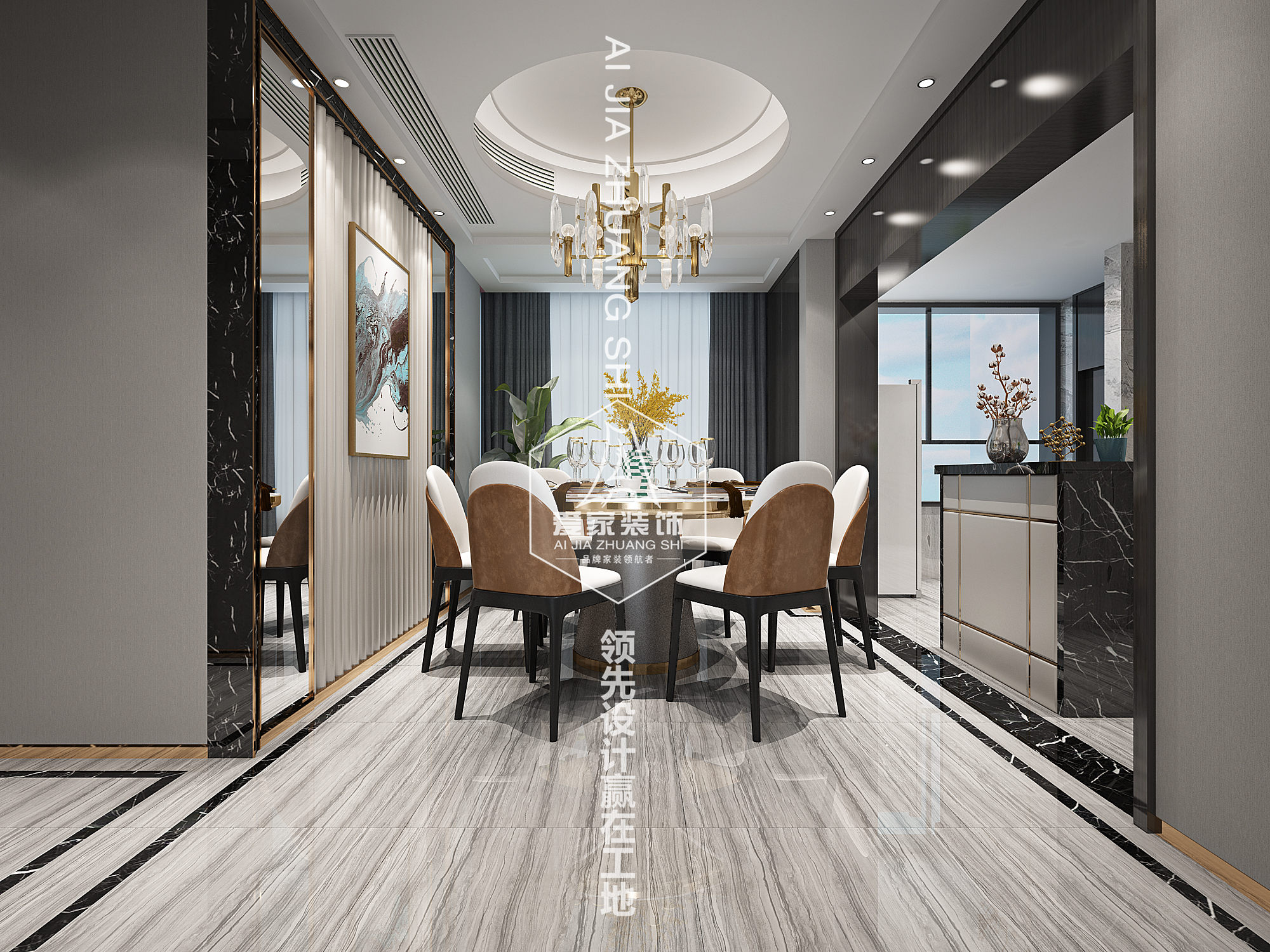 本案客廳采用深卡色與高級(jí)灰為主色調(diào),大量的皮革、大理石作為主要材質(zhì),以少量的絨質(zhì)面料,加以調(diào)和。挑選銀器作為提亮空間的點(diǎn)睛之筆,顏色的融合,將奢華與雅致完美結(jié)合。背景墻上深灰藍(lán)的金屬裝飾畫相映生輝,如果說(shuō)大海代表著困境而那斑駁的金色鐵片即是穿越荊棘滿身傷痕后出現(xiàn)的那一輪紅日!
